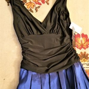 Blue taffeta type bottom with a Black swirl