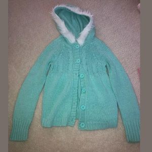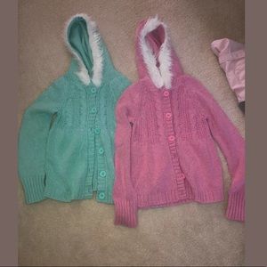 Girl’s Justice Hooded Cardigan Sweater (Size: Small/10). Condition is Pre-owned, in good condition. Aqua and pink knit cardigan sweaters with hood. Pet free and non smoking home.