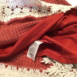 This orange/ rust colored waffle print a-line Altar’d State dress is so cute and perfect for fall and spring! Features turtleneck and crochet detailing on hem. Lined. Pairs well with ankle boots! Size small.