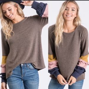 Brushed knit color block ruffle detail long sleeve top