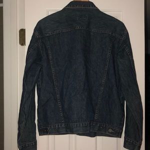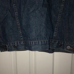 This item is pre-iced, but the only sign of use is slight discoloration at the tag. It features two buttoned pockets, two regular pockets, button up sleeves, and adjustable straps on the back if you desire a tighter or looser fit. The denim is all clean and is in very good condition. Perfect for chilly weather to stay warm and stylish. Comes from a smoke free and pet free home.