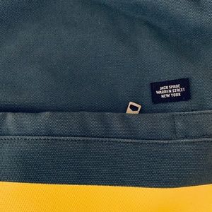 Jack Spade Industrial cotton canvas with waxwear trim. Like new - it was used once; there are some very small marks on the bottom of the yellow dip. Color is closest to the front and back images - interior detail shots are much more light/faded than it actually is! The handle on top and bottom of the shoulder straps are a nice contrasting darker blue.