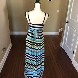 Black, white, grey, blue, and green stripped maxi maternity and nursing dress. Gently worn. The brand is called “Allison Brittney”.