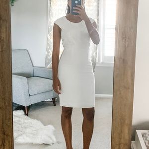 Professional white dress by Antonio Melani. Detail on bust. In good used condition. Can be worn in a professional setting and the cocktails after. I’m selling because I am downsizing my work wardrobe.