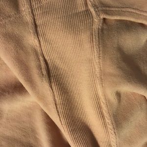 Ribbed material like cuffs goes up the side of sleeves, on sides of garment, and collar