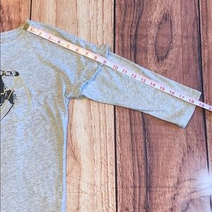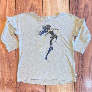 Rarely worn Wonder Woman T-shirt! I’m light gray with a picture of Wonder Woman on the front with gold embellishments and sequins. The sleepovers are 3/4 length with a ruffle on top. It is an oversized T-shirt so it looks perfect with leggings or jeans. No stains or signs of wear. It is gap girls sized XL(12)