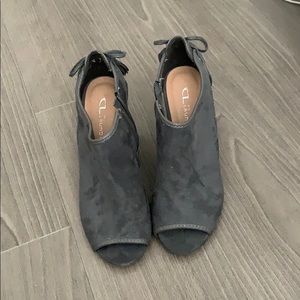 Blue/grey open toed wedge with zipper on side and tie on back