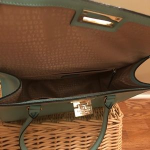 Almost robin egg blue in color, this purse will surely have you complimented all day long! It’s got one main compartment, a side zipper compartment, 2 side pockets. Pristine condition, from a clean, pet and smoke free home.