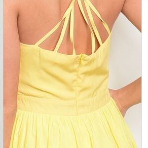 NWT Pale Yellow Cage Bust Lace Hem Sundress. the absolute perfect dress for summertime. lightweight, comfortable, easy to wear and so elegant. solid color makes it easy to pair with bright and bold statement jewelry and accessories. Hidden zip and beautiful inlaid fleur-de-lis like pattern hidden in the material. 100% rayon material is elegant, fun and easy to wear. take this beauty home to wear all spring and summer long! Super strappy for a unique look. absolute spring and summer must have!