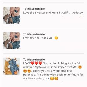 @laurellmarie hi I haven't read any comments yet so is this an outfit mystery box, I'm interested in items for reselling. What sizes do you have? and brands, I've purchased many n they have to be in like new Condition, I don't sell anything less then that, nor do I want to take the time, to shave, remove stains etc. Just being real thanks Cindy.