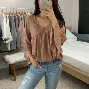 gauze, lace trimmed ruffle sleeve woven top Light weight, relaxed fit