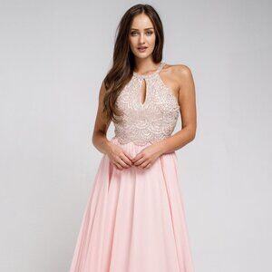 Sleeveless Lace Bodice Sweetheart Neckline A-Line Shape Long Evening Prom Bridesmaid Dress with open back and zipper closure.