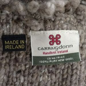 This designer was having fun, traditional car coat styling in a sweater with a full textural collar. Great yarn with an undyed look - very natural look and will combine fabulous with other neutrals. Made in Ireland, label says handknit and 100 percent pure new wool. Maker Carraigdon. Marked S, please go by measurements! Length 32", bust closed 37", hips 44". Washable by hand. Condition very good, some light pilling (hard to see because it is so nubby textured, easy to snip). Front patch pockets.