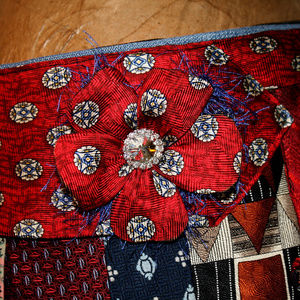 This awesome purse was created from 11 men's silk upcycled neck ties. Base of the denim bag is 13 x 13 x 2. Ties hang about 2 inches below. Fully lined with black satin. Has both an inner and outer pocket. Zips closed, has matching rag doll purse charm as zipper pull. Decorated with a matching silk tie flower with a crystal rhinestone in the middle and eyelash behind for whispyness. Has a great boho gypsy charm to the patchwork design. Can be worn as a crossbody or shoulder bag. (11179)