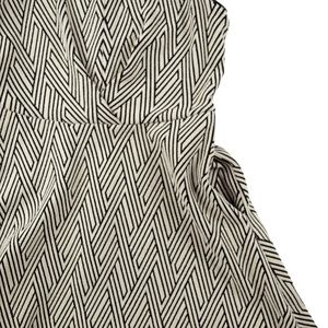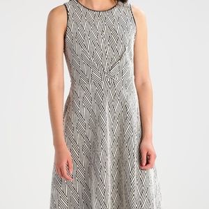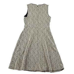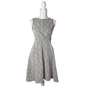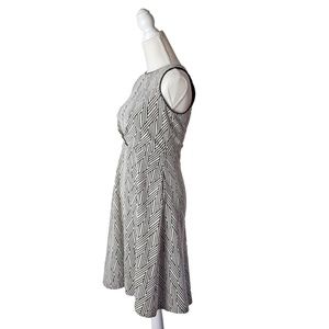 Description: A womens black & cream sleeveless diamond geometric print textured dress by Banana Republic. Features a criss-cross pleat design at front waist seam, fit and flare skirt that hits just right above the knee depending on height & side seam pockets. Armholes and neckline are trimmed in faux black leather pipping. Cotton/Poly/Spandex.