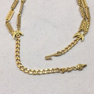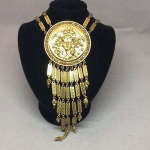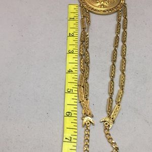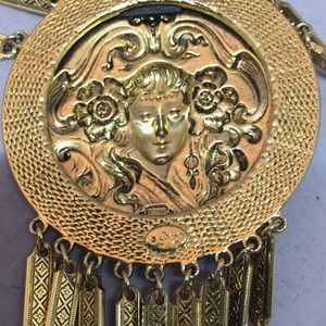 Brushed gold tone necklace with large (2 1/2”) center medallion of woman’s head in a beautiful Art Nouveau style. Around the outer edge is a row of amber rhinestones. Nine chains in varying lengths, dangle from bottom of medallion, all with etched and antiqued links. Chain is 13” long with 4” extension. Stunning. In excellent condition, this necklace would make any outfit shine!