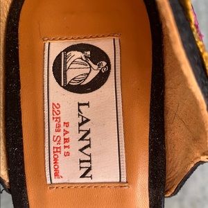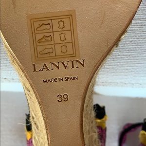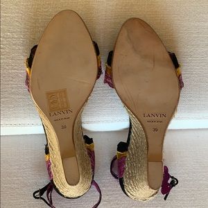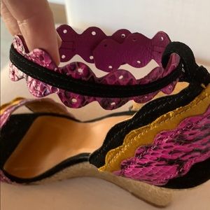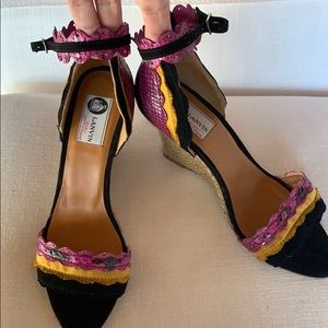LANVIN Paris Wedge Sandals. Black suede with golden yellow and magenta printed snakeskin detail 3.5” braided rope wedge heel. Size 39 (LANVIN generally runs a bit small) from a pet free, smoke free home. Thank you for your interest!