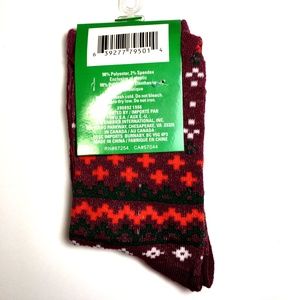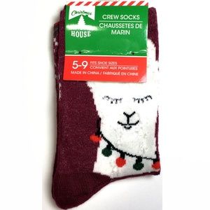 Fun holiday llama socks. Maroon socks with white furry llama wearing a Santa hat and Christmas light necklace. Fits shoe sizes 5-9. New with tags! Please see photos for details.