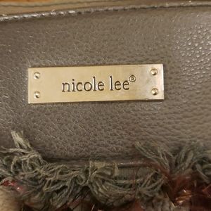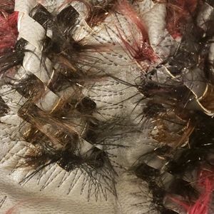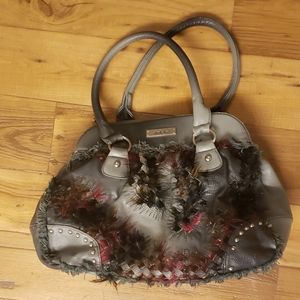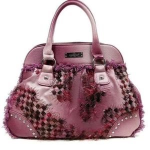 One side solid gray, opposite side square cutouts with pink, purple and black fur and silver studs