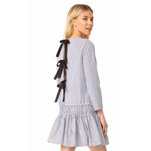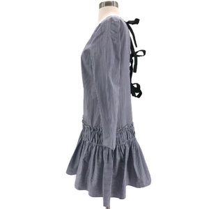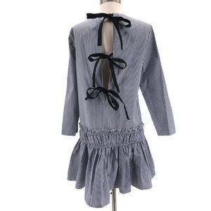 Cute drop-waist dress in blue and white pinstripe by English Factory. Ribbon tie back and ruffle hem. Excellent condtion - new with tags. Size tag says XS - fits like a medium - see measurements.