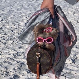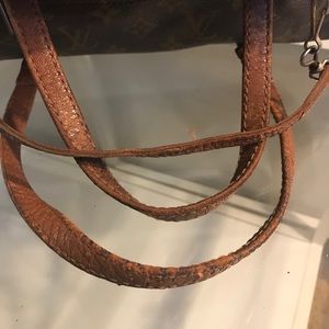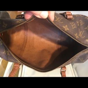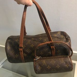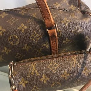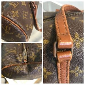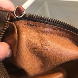 This baguette is crafted of Louis Vuitton monogram coated canvas. This is reinforced with treated vachetta cowhide leather including piping around the ends and side straps that extend into strap handles. There is minimal brass hardware including strong handle links and a top zipper that will last generations. No date code in 1970s-see heatstamp. Leather aging,wear on handles, hardware tarnish.6 by 2.5".