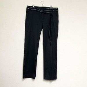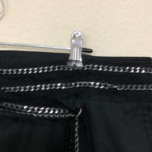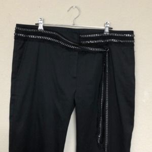 Philosophy di Alberta Ferretti black dress pants with decorative attached chain & sheer silk belt. Details include a straight leg, 2 pockets, & zipper with hook/eye closure. Cotton. Dry clean.