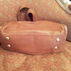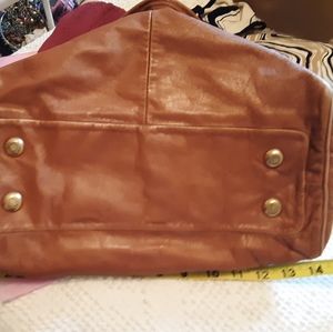 Caramel 100% leather satchel. Slouchy, double straps, Large front outside pocket and smaller pocket on each end of bag. Gold stamped hardware. Gold feet on bottom of bag and top zipper. Two open inside pockets and one zipper pocket. Fairly new in like new condition. L 14" x W 6", 10" deep, & 9" shoulder strap drop.