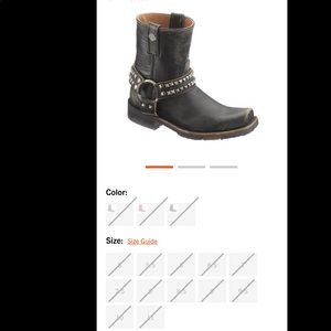 Made with the best full grain leather uppers available, a full-length soft cushioned sock lining, and leather lined. Designed with a square toe, 3 riveted front, back and bottom straps attached to a side O-Ring, metal studs on the front and back straps, and a very small Harley® Bar & Shield badge on the pull-tabs. Total height: 8.25-inches, Shaft: 7-inches, Heel: 1.25-inches. Rubber outsoles afford the flexibility for a soft and comfortable ride, or while walking or standing.