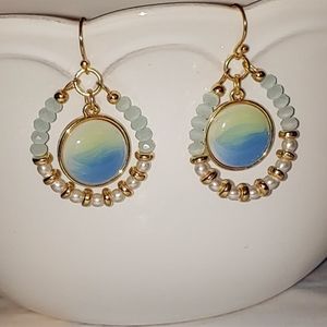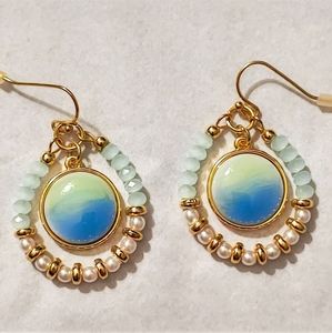 Set in gold plated sterling silver these gorgeous blue, green, and yellow beaded dangle earrings have a french hook back. Outer hoop of earrings contain blue beads with white, yellow, and gold alternating beads at the bottom. Inner dangling pendant is a glass cabochon shading from light green to yellow to dark blue.
