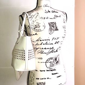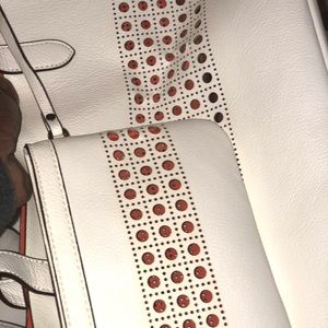 Tote Bag material is slightly wrinkled because bag was in storage. Matching wallet has a slight light brown color on one side (see pictures). This bag set is gorgeous and is brand new and unused.