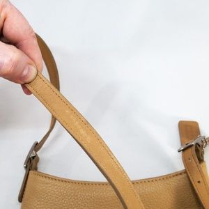 Soft, supple pebble-textured leather in a light tan makes this little bag irresistible. Embossed brushed nickel finish hardware. Dimensions 7" x 9" x 3". Adjustable strap with drop 20" - 22". Lined with black fabric with a subtle stripe. Top zipper closure, outer slip pocket and inner slip pocket. Areas of darkening and a scratch on the underside of the strap (see photos). Bag is in great condition overall. Thoroughly cleaned, conditioned, polished, and ready for use. Rare find!