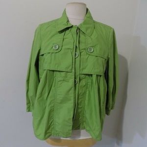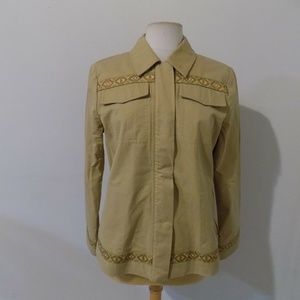 Description: V-neckline, button front closure, 3/4 length sleeves, coca tulling and beige semi-sheer trim around neckline and button front area, vertical rib trim around hemline, neckline, and sleeve cuffs