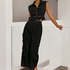 This sexy black top features sassy criss cross sleeves! Easy to grab and go! Pair with jeans/white pants, heels and a town hat.