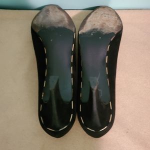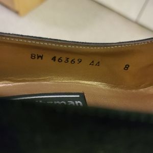 Very good condition with some normal wear from age and use, here and there (see photos). Also, one of the caps on one of the heels is slightly worn (easy fix), but the pump is still very much wearable, in my opinion. Will leave to the buyer whether or not to have fixed. Suede, black with lovely gold accents with a 2 7/8 heel height. Gorgeous pair of shoes to add to your collection!