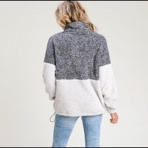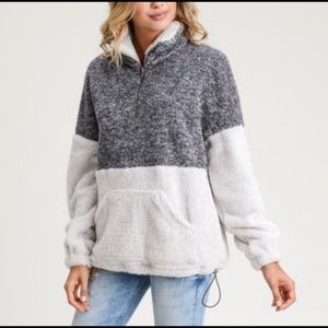 This gray and white pull over has a toggle to adjust the hem size and a comfy kangaroo pouch in front.