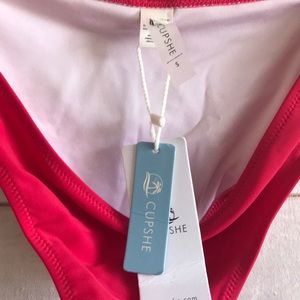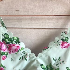 New with tags, tried on then never wore, bottoms still have protective lining. Features a sweet floral top with scallop trim detailing, soft padded removable cups, adjustable straps. Bottoms are a beautiful red color, sit at the hips, cheeky.