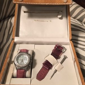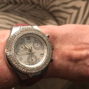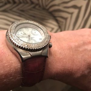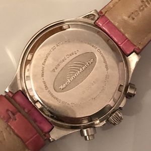 Gorgeous Technomarine Techno Diamond Chronograph Watch with Diamond Bezel. Two rows of diamonds = 1 ct tw . Mother of Pearl dial. Genuine alligator leather band. Also comes with interchangeable rubber band and tool. SW00980 Back of watch: all stainless steel, resistant 20 atm, swiss movement, chronograph, Techno Diamond TM. Comes in beautiful suede Technomarine case. Needs battery. Gently used condition. Color is purple/lilac.