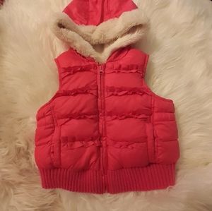 Pink puff vest warmly lined with ruffles, pockets, and hood with faux fur trim. 6-12 months