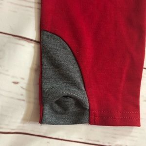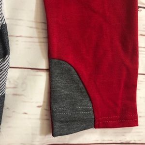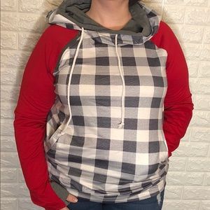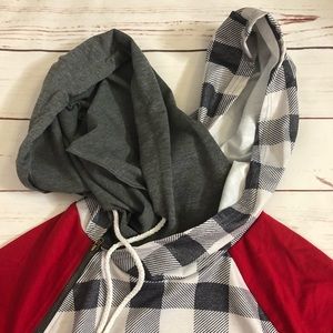 The body and outer hood are heathered Black and White Buffalo Plaid. The second hood and the thumb hole are dark grey and the sleeves are red. There’s a zipper connecting one shoulder. This hoodie is lightweight and VERY stretchy!