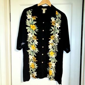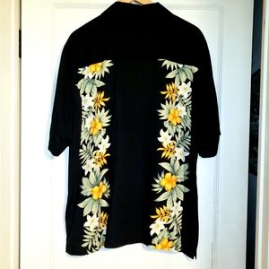 Black short sleeve collared button front shirt with Hawaiian floral sides, by Islander in size medium. Also looks guayabera style straight bottom designed to be worn untucked, rockabilly. No obvious flaw or damage. Barely used, bought wrong size. Approx 24" across at armpits.