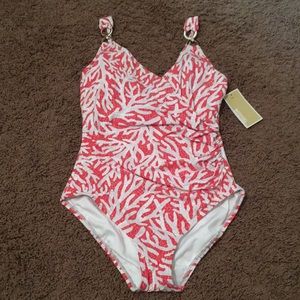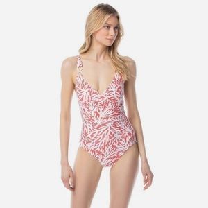 Brand new never been worn. With tags attached. From the Coral Mosaic Collection. Chic matte jersey one-piece swimsuit enhanced with an allover print. Deep V-neck. Adjustable shoulder straps with ring detail. Removable soft cups. Pull-on style. Side gathered detail. Mid-support level. Full coverage. Lined Nylon/spandex. Swimsuit Fabric: 85% Nylon/15% Spandex. Imported. Color: Sea Coral. Comes from a pet/smoke free home.