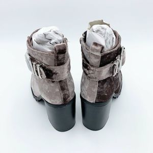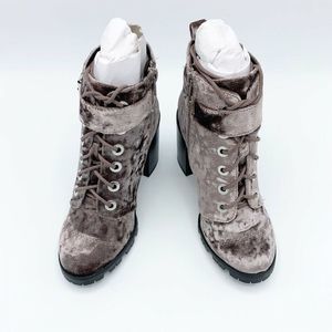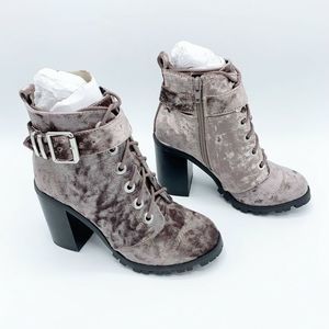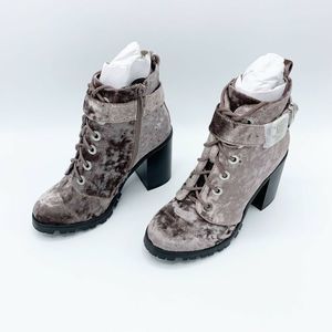 Qupid Velvet Ankle Boots Block Heel Lace Up Buckle