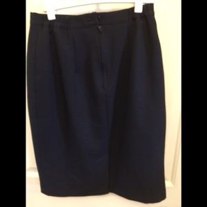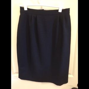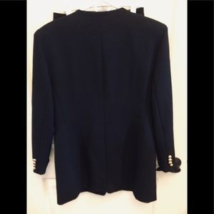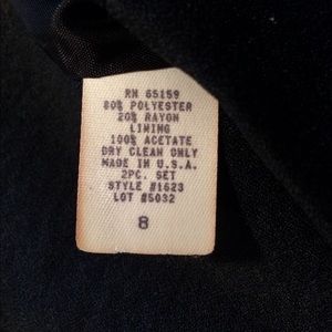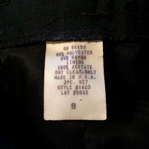Black suit in Very Good condition; Jacket has gold buttons; Skirt has Back zipper with elastic on both sides of the skirt; 80% Polyester 20% Rayon; Lining 100% Acetate; Dry Clean; Size 8