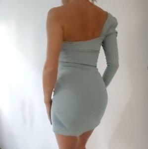 Epic dress!!! Perhaps a one of a kind; purchased at stylists trunk sale, this beauty has a the most sublime one shoulder with subtle puff sleeve cut ever!!! Beautiful pale denim and raw hem finish (I wore it once tucked under to a celebrity artists private reception), slightly stretchy I'm 5'9 34b/32small c , 25 waist and 35 hip. Superb condition (label came off so there are no sizes etc on this), priced accordingly