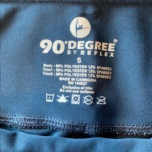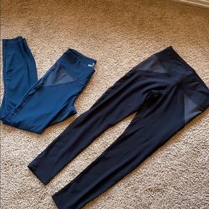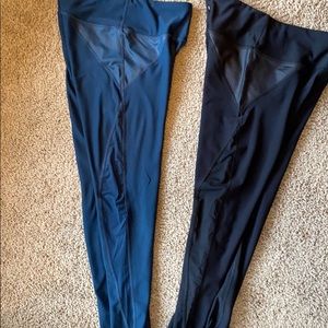 Black and blue(indigo) leggings. With waist detail and mesh in side of legs. 34 inches long. Both worn one time. Great fabric. Just to big for me.