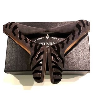 Prada Camoscio T Ardesia. Gunmetal grey & black leather and suede heels. Gorgeous details. Please zoom in on photos. Comes with original box and dust/travel bag. Includes extra pair of heel tabs. Psuedo platforms! Comfortable shoe. 3 ½" suede covered heel