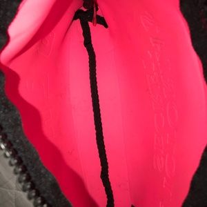 💕NWT HUGE Iridescent tote. Holds lots of stuff for the beach or pool. Water proof pink pouch. Has some marks on it. Please c pics. If u need additional pics just ask. 5 polka dot paper cards. A NWT Loofa and a small stripped bag with tissue paper. Everything n pic u get.💕 Smoke free home. Fast shipper.