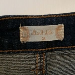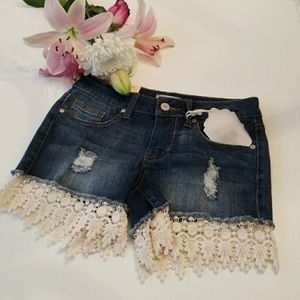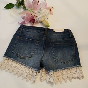 Super cute distressed denim shorts with beautiful decorative crocheted trim. They do have some stretch to the material. Altar'd State size chart listed above.