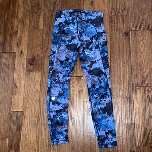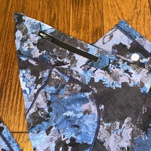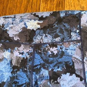 Mix of different shades of colors- blue, purple, black... smoke free home. Inseam is about 26”. Zipper compartment on back part of waist line