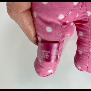 Victoria’s Secret plush dog. Measures 6.5” x 9”. Dog is pink with white polka dots, wearing a red T-shirt with a heart & peace sign. Pristine like new condition.
